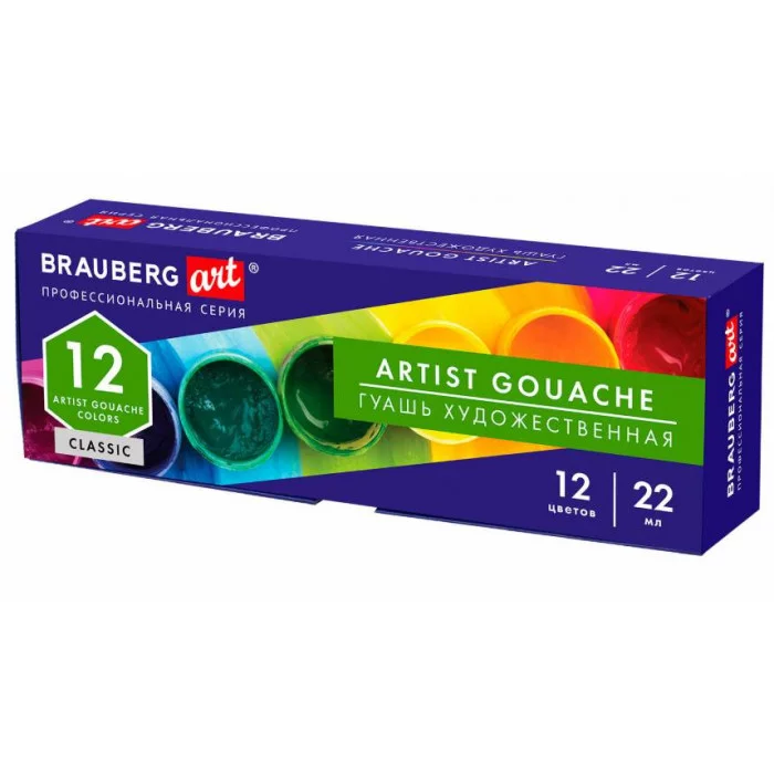 Художественная гуашь профессиональной серии BRAUBERG ART CLASSIC предназначена для живописи, художественных и декоративно-оформительских работ. Обладает высокой укрывистостью. Быстро сохнет, сохраняет яркий и насыщенный цвет.