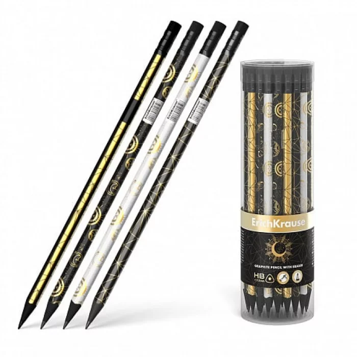Эргономичный трехгранный чернографитный карандаш из отборной древесины с ластиком, твердость НВ. Четыре дизайна корпуса карандаша с фольгированными элементами, черное дерево, ластик черного цвета. Специальная пропитка древесины и сплошная проклейка грифеля обеспечивает высокую ударопрочность. Мягкая древесина и идеальная центровка грифеля гарантируют легкую заточку с экономным расходом карандаша. Грифель диаметром 2.2 мм не царапает бумагу и не крошится. Ластик карандаша средней жесткости изготовлен из экологически чистого и гипоаллергенного материала термопластичной резины (TPR). Не содержит ПВХ. Длина 188 мм.