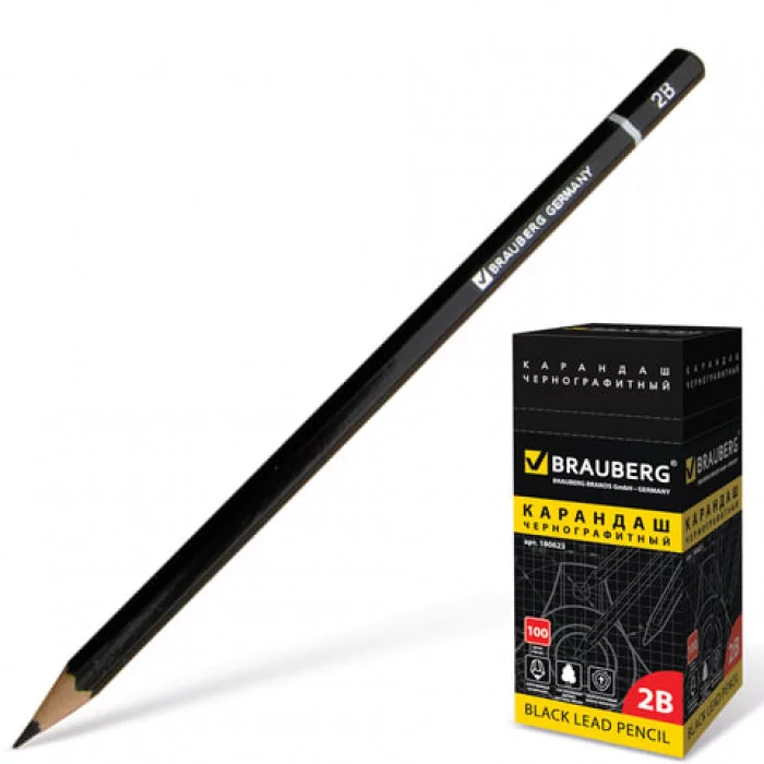 Карандаш чернографитный BRAUBERG, 1 шт., "Touch line", 2В, без резинки, корпус черный, заточенный, 180623