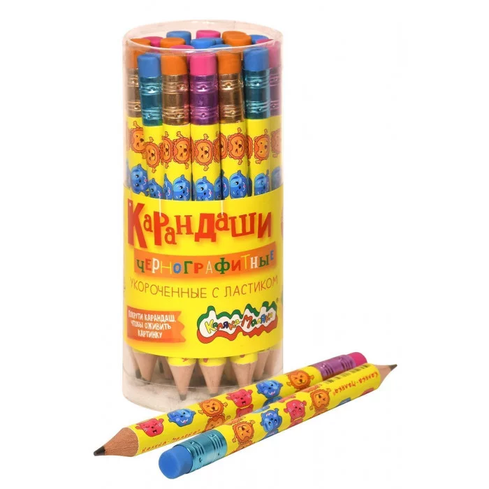 Чернографитные карандаши, созданные для малышей имеют специально разработанный размер — 2/3 стандартного и утолщенный диаметр, чтобы его можно было удобно держать в ручке. Яркие персонажи и разноцветные ластики развеселят юных творцов. А круглая форма карандаша обеспечивает настоящую магию – поверни карандаш горизонтально и покрути его в пальцах, чтобы персонажи на корпусе начали двигаться.