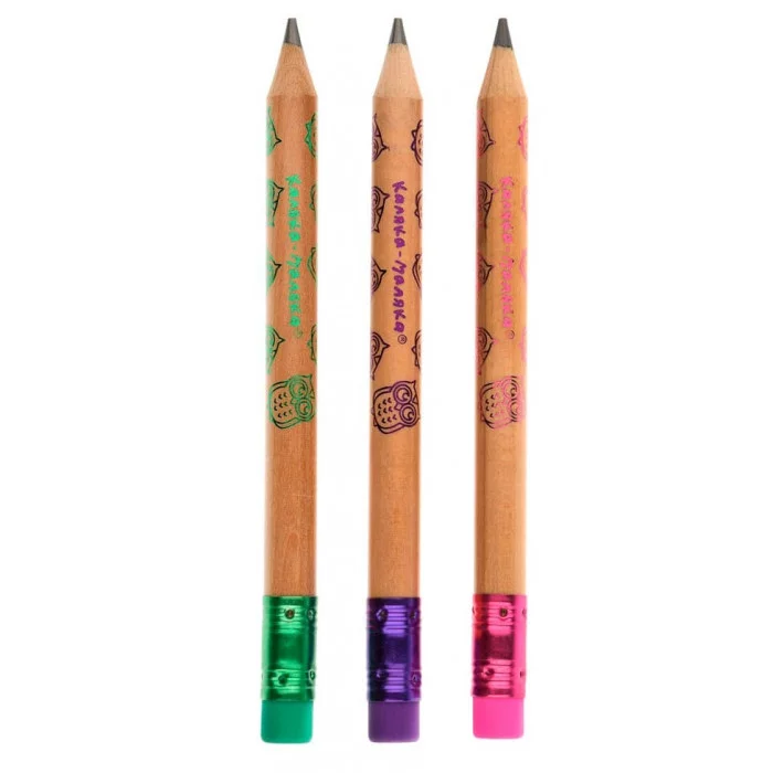 Чернографитные карандаши, созданные специально для малышей имеют специально разработанный размер — 2/3 стандартного и утолщенный диаметр, чтобы его можно было удобно держать в ручке. Круглый корпус без краски и лака обеспечит безопасность маленьким художникам. А веселые разноцветные совы и огромные разноцветные ластики развеселят юных творцов.