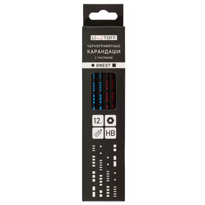 Карандаш чернографитный с ластиком "ONEST" HB, шестигранный корпус, заточенный. 12 шт. в картонной коробке с европодвесом ONEST КЧГОЛ120003