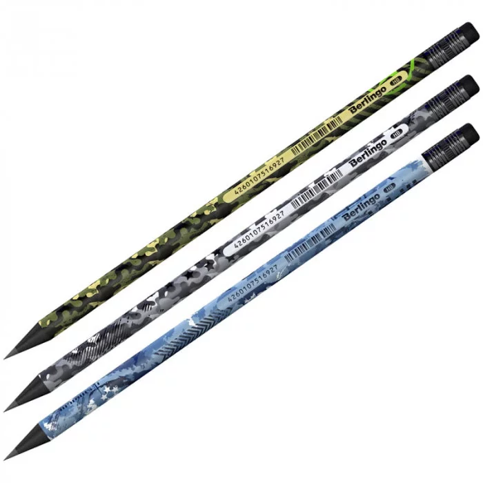 Чернографитный ударопрочный карандаш Berlingo "Military" из черного дерева, с ластиком, с заточкой. Матовое покрытие корпуса, дизайны ассорти. Не ломается при падении. Безопасен для детей, в случае разлома, не оставляет мелких и острых фрагментов. Подходит для черчения и рисования. Диаметр грифеля 2,2 мм, твердость HB, круглая форма, штрих-код на корпусе.