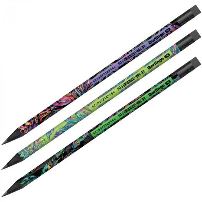 Чернографитный ударопрочный карандаш Berlingo "Neon Paradise" из черного дерева, с заточкой и ластиком. Матовое покрытие корпуса, дизайны ассорти. Не ломается при падении. Подходит для черчения и рисования. Диаметр грифеля 2,2 мм, твердость HB, круглая форма, штрих-код на корпусе.