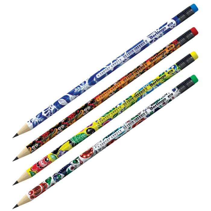 Чернографитный карандаш из липы, с ластиком, с заточкой. Яркие русские узоры ассорти. Специально обработанная древесина для идеальной заточки. Подходит для черчения и рисования. Диаметр грифеля 2,2мм, твердость HB, круглая форма, штрих-код на корпусе. Упаковка в прозрачную разъемную ПВХ-тубу с возможностью использования в качестве подставки.