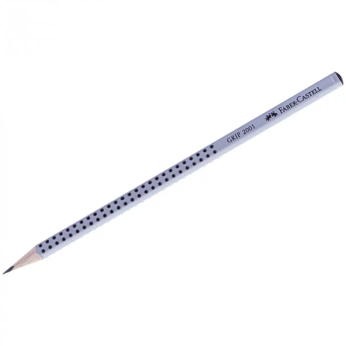 Запатентованное покрытие корпуса делает карандаш Grip 2001 от немецкого производителя Faber-Castell уникальным. Его трехгранная форма снижает напряжение руки, а нанесенный на корпус объемный рисунок предотвращает скольжение пальцев. Корпус серого цвета покрыт экологически чистым лаком на водной основе. Благодаря специальной технологии проклеивания грифеля (SV), грифель не ломается при падении и затачивании. Твердость: 2B.