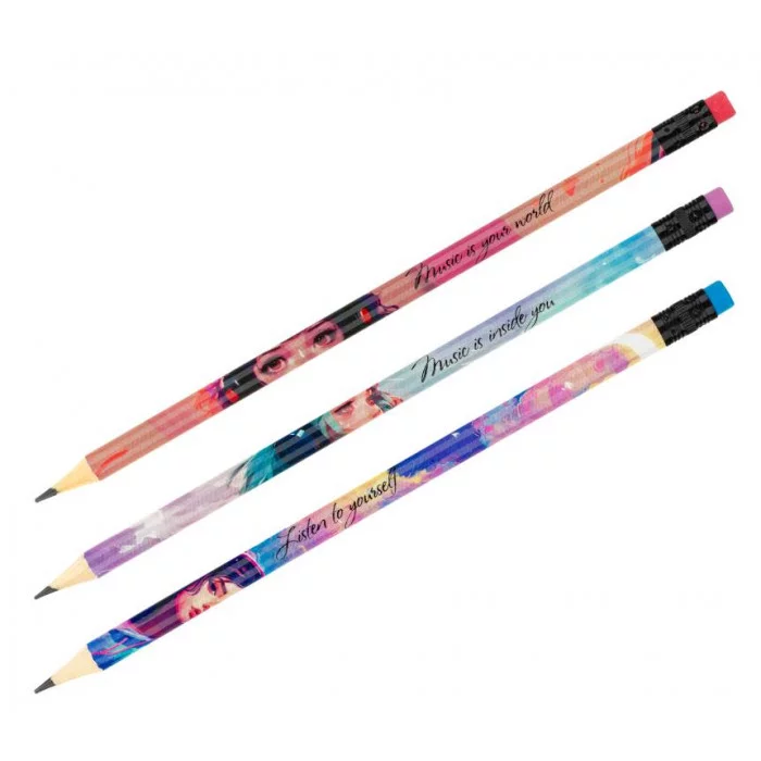 Чернографитные карандаши MESHU "Girls and music" с печатью на корпусе и цветным ластиком — аксессуары, которые не дадут заскучать на учёбе или работе. Они представлены в круглом корпусе с тремя разными дизайнами. Твёрдость грифеля — HB. Длина карандаша — 190 мм. Диаметр — 2,2 мм.