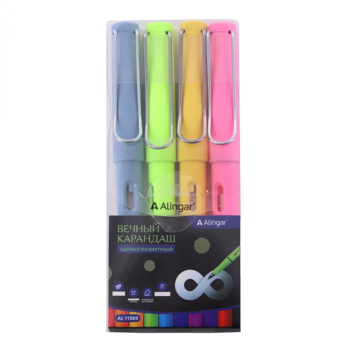 Набор вечных ч/г 4шт карандашей Alingar, пластик, с ластиком, круглый, заточенный, корпус ассорти цветов "Неон", ПВХ упаковка AL11069