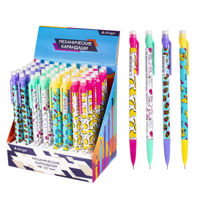 Карандаш механический Alingar HB, с ластиком, круглый, 7 мм, пластик. корпус ассорти, картонный стенд по 48 шт., "Увлекательная неделя" AL9673