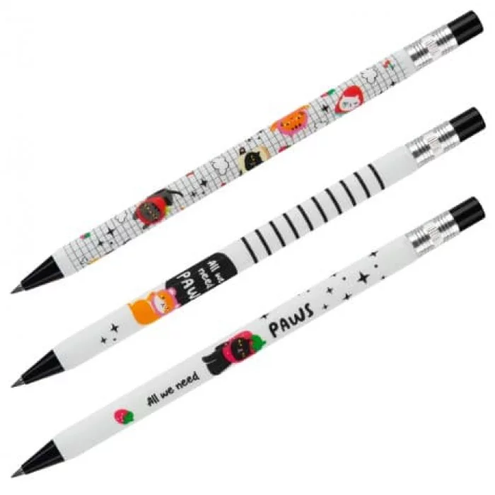 Механический карандаш Relax Cat от MESHU задаст особое настроение для учёбы или творчества. Дизайн корпуса порадует любителей необычной канцелярии и вдохновит на новые шедевры. В дизайне присутствуют котики, они будто «живут» в школьных тетрадях. Стильные яркие рисунки нанесены при помощи высококачественной термотрансферной печати. Шестигранный пластиковый корпус выполнен в приятном на ощупь покрытии soft-touch. Точилка для грифеля вверху карандаша сделана в виде ластика. Любителям рисовать или делать записи карандашом не придется постоянно его подтачивать. Карандаш удобно брать с собой благодаря тому, что наконечник легко убирается. Он не сломается и не испачкает подкладку пенала. Творчество или учёба станут проще и продуктивнее. Карандаши упакованы в пластиковую тубу по 24 штуки. Набор карандашей состоит из трёх цветов: фиолетовый, розовый и голубой. Диаметр грифеля: 2 мм; Диаметр корпуса: 8 мм; Твёрдость: HB; Длина: 150 мм; Форма корпуса: шестигранная; Цвет корпуса: ассорти;