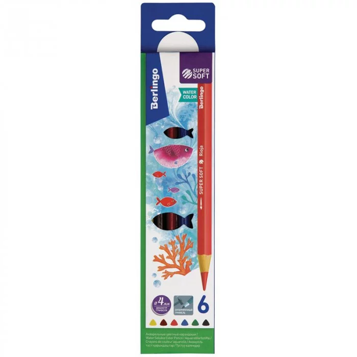 Карандаши акварельные Berlingo "SuperSoft. Рыбки", 06цв., трехгран., заточен., картон, европод 297241