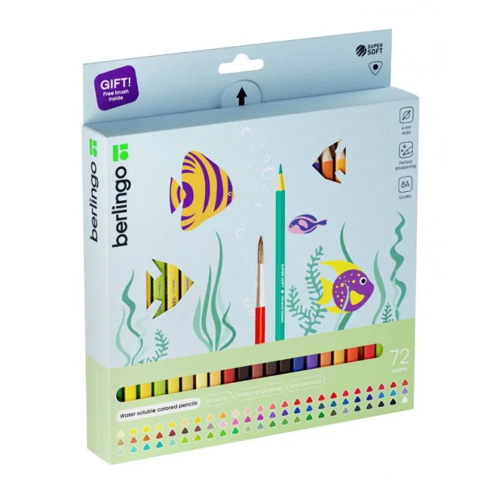 Карандаши акварельные Berlingo "SuperSoft. Рыбки", 72цв.+кисть, трехгран., заточен., картон, европод