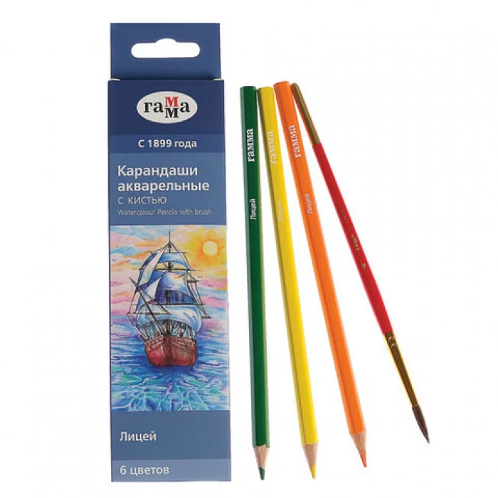 Карандаши акварельные ГАММА "Лицей", 6 цветов, заточенные, шестигранные, кисть, картонная упаковка, 221118_01