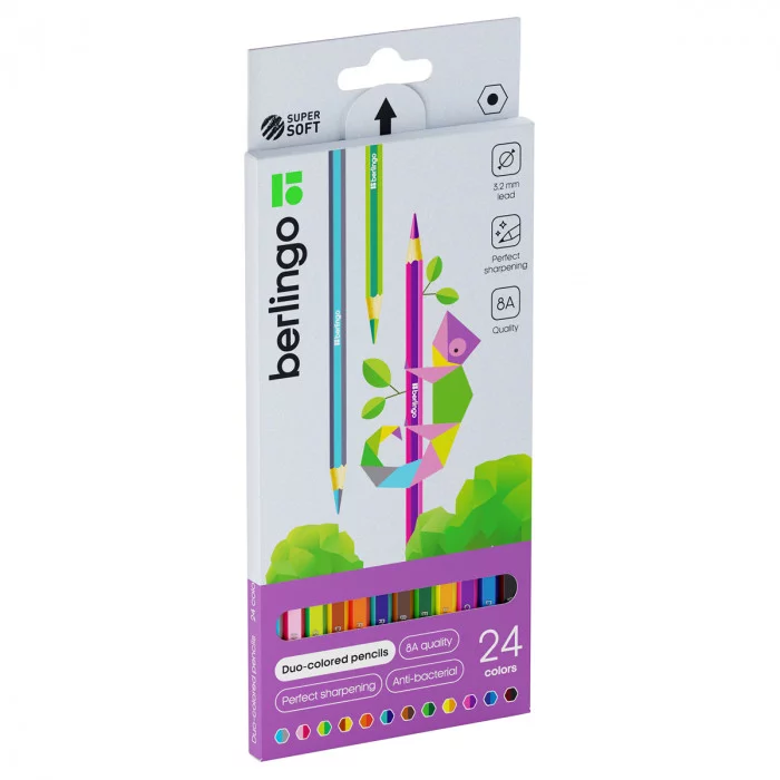 "SuperSoft" - линейка качественно новых цветных карандашей Berlingo. Карандаши с уникальным двухцветным грифелем. Идеально подойдут для раскрашивания, с эффектом мягкого перехода цвета. 12 карандашей - 24 цвета. Шестигранная форма корпуса, окрашенная в два цвета. Указание цвета на каждом карандаше на английском языке. Упаковка в плотную матовую картонную коробку с европодвесом. Грифели высочайшего стандарта качества 8А, являющегося максимальным для нехудожественных цветных карандашей. Мягкость письма, сравнимая с рисованием маслом и пастелью. Яркие насыщенные цвета, обладающие превосходной смешиваемостью. Увеличенная до 3,2 мм толщина грифеля для безупречно комфортного раскрашивания. Уникальная формула и технология производства грифелей, в результате которой достигается одновременно удивительная мягкость письма и прочность, позволяющая грифелю выдерживать даже сильное нажатие под углом 45 градусов. Специальная проклейка, предотвращающая поломку грифеля внутри карандаша при падении. Стойкость к повреждениям. К