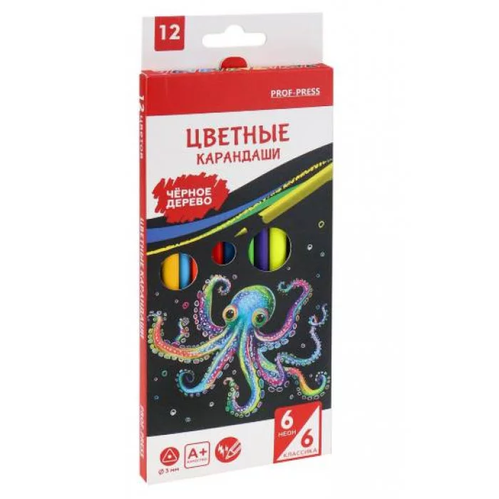 Карандаши цв. НЕОНОВЫЙ ОСЬМИНОГ, неоновые и классич (КЦ-3876), трехгран.наб12 цв, d=3мм, 2М, КЦ-3876