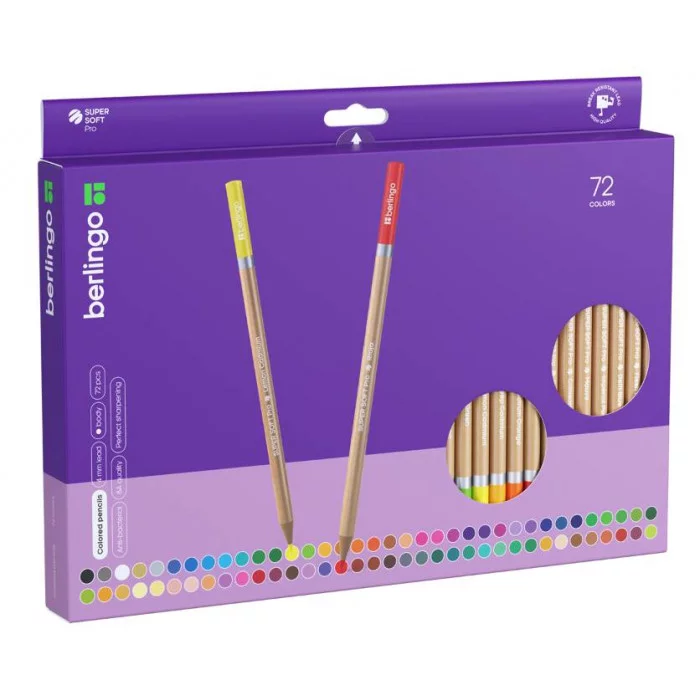 Цветные карандаши Berlingo SuperSoft. Pro идеально подойдут для творчества. SuperSoft. Pro – премиальная линейка цветных карандашей Berlingo высшего качества. В наборе 72 ярких насыщенных цвета, обладающих превосходной смешиваемостью. Цвет на каждом карандаше указан на английском языке. В карандашах используется грифель высочайшего стандарта качества 8А, являющегося максимальным для нехудожественных цветных карандашей. Безупречное и комфортное раскрашивание обеспечивает увеличенная до 4 мм толщина грифеля. При производстве грифеля использована уникальная формула и технология, в результате которых достигается одновременно удивительная мягкость письма и прочность, позволяющая изделию выдерживать даже сильное нажатие под углом 45 градусов. Мягкость письма можно сравнить с рисованием маслом и пастелью. Карандаши стойкие к повреждениям – специальная проклейка предотвращает поломку грифеля при падении. Круглый корпус диаметром 7 мм выполнен из древесины высшего качества, прошедшей тщательную обработку. Материал, со