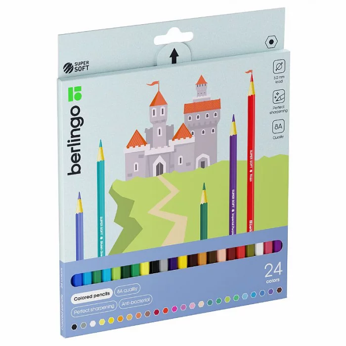 "SuperSoft" - линейка качественно новых цветных карандашей Berlingo. 24 цвета. Шестигранная форма. Указание цвета на каждом карандаше на английском языке. Поле для подписи имени владельца на каждом карандаше. Упаковка в плотную матовую картонную коробку со склеенным европодвесом. Грифели высочайшего стандарта качества 8А, являющегося максимальным для нехудожественных цветных карандашей. Мягкость письма, сравнимая с рисованием маслом и пастелью. Яркие насыщенные цвета, обладающие превосходной смешиваемостью. Увеличенная до 3,2 мм толщина грифеля для безупречно комфортного раскрашивания. Уникальная формула и технология производства грифелей, в результате которой достигается одновременно удивительная мягкость письма и прочность, позволяющая грифелю выдерживать даже сильное нажатие под углом 45 градусов. Специальная проклейка, предотвращающая поломку грифеля внутри карандаша при падении. Стойкость к повреждениям. Корпус из древесины высшего качества, прошедшей тщательную обработку. Материал, сохраняющий свою проч