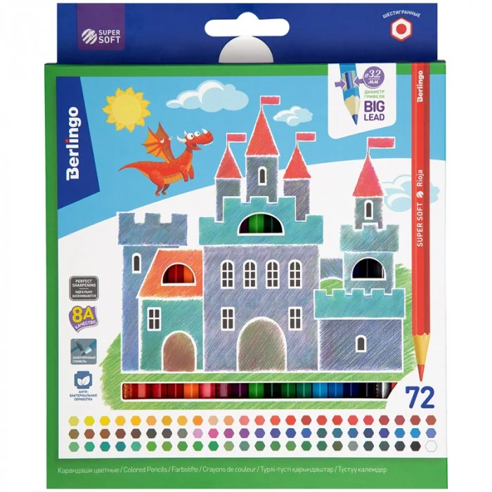 "SuperSoft" - линейка качественно новых цветных карандашей Berlingo. 72 цвета. Шестигранная форма. Указание цвета на каждом карандаше на английском языке. Поле для подписи имени владельца на каждом карандаше. Упаковка в плотную матовую картонную коробку со склеенным европодвесом. Грифели высочайшего стандарта качества 8А, являющегося максимальным для нехудожественных цветных карандашей. Мягкость письма, сравнимая с рисованием маслом и пастелью. Яркие насыщенные цвета, обладающие превосходной смешиваемостью. Увеличенная до 3,2 мм толщина грифеля для безупречно комфортного раскрашивания. Уникальная формула и технология производства грифелей, в результате которой достигается одновременно удивительная мягкость письма и прочность, позволяющая грифелю выдерживать даже сильное нажатие под углом 45 градусов. Специальная проклейка, предотвращающая поломку грифеля внутри карандаша при падении. Стойкость к повреждениям. Корпус из древесины высшего качества, прошедшей тщательную обработку. Материал, сохраняющий свою проч