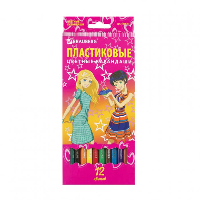 Карандаши цветные BRAUBERG "Pretty Girls", 12 цветов, пластиковые, заточенные, картонная упаковка, 180576