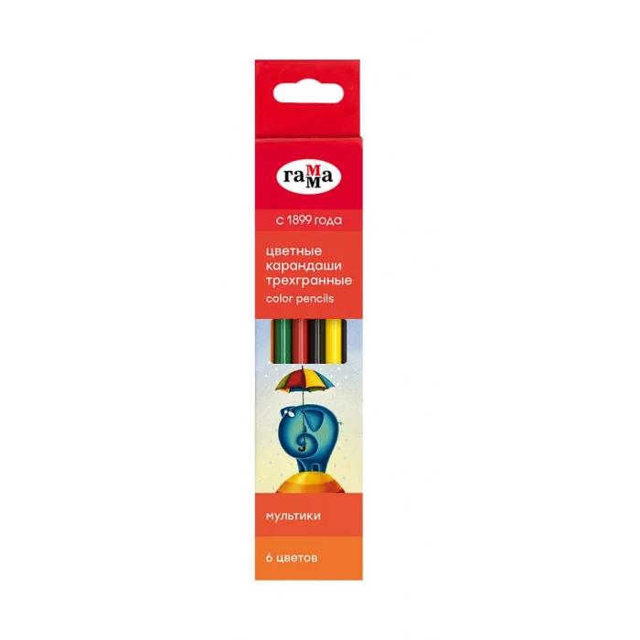Цветные карандаши ГАММА серии «Мультики» выполнены в эргономичном трехгранном корпусе, который подскажет ребенку, как правильно держать инструмент во время творческих занятий. В наборе 6 цветов: чёрный, оранжевый, синий, жёлтый, зелёный, красный. Диаметр грифеля — 2,9 мм. Проклеенный ударопрочный грифель не крошится во время заточки и не ломается даже после падения. Корпус карандаша диаметром 7 мм и длиной 174 мм изготовлен из дерева. Специальная обработка древесины позволяет легко заточить карандаш без зазубрин и заноз. За яркость и высокую укрывистость отвечают качественные пигменты в составе. Ребенку не придется сильно давить на карандаш — рисунок получится ярким и равномерно закрашенным. Упаковка – картонная коробка с европодвесом. Количество цветов: 6; Форма корпуса: трёхгранная; Заточка грифеля: да. Количество карандашей: 6.