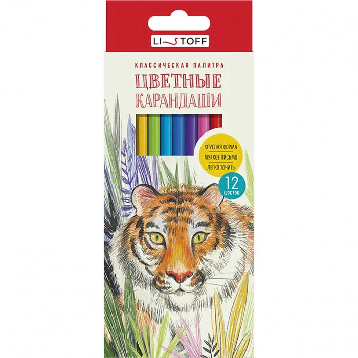 Карандаши цветные. Классические цвета, круглый корпус, заточенные. В наборе 12 цветов Тигр КЦК120014