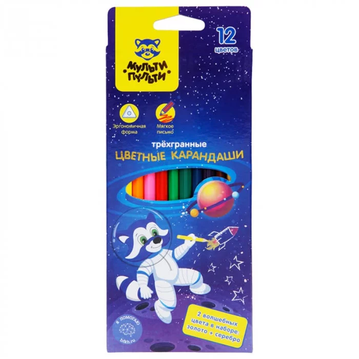 Карандаши цветные Мульти-Пульти "Енот в космосе", 12цв., трехгран., заточен., европодвес 304689