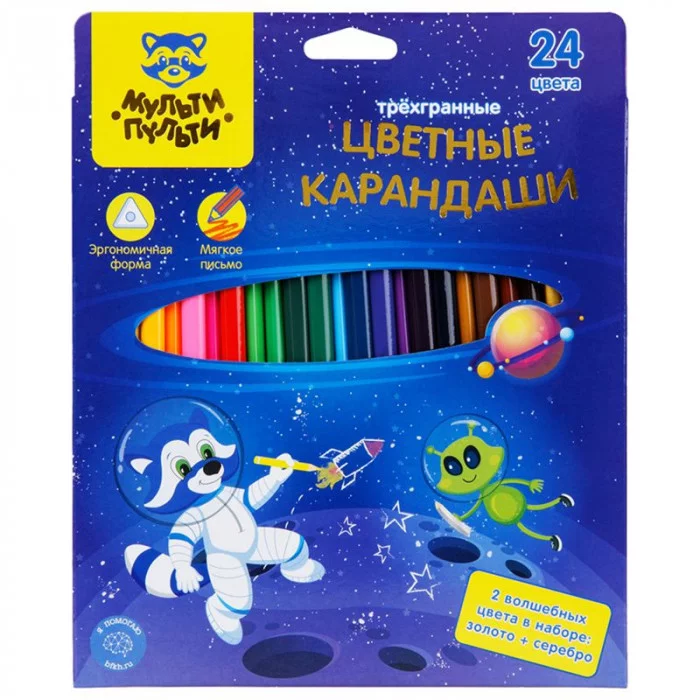 Карандаши цветные Мульти-Пульти "Енот в космосе", 24цв., трехгран., заточен., европодвес 304691
