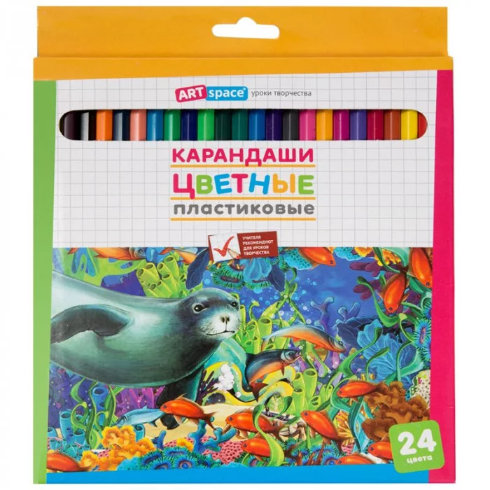 Набор цветных карандашей, ARTSpace "Подводный мир", 24 цветов, картонная коробка с европодвесом. Материал - пластик. Карандаши легко затачиваются, имеют гибкий пластиковый шестигранный корпус, яркие естественные цвета и прочный грифель. Карандаш гнется, на сломе нет острых краев.