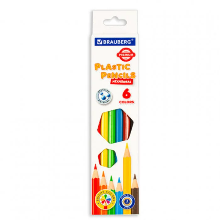 Карандаши цветные пластиковые BRAUBERG PREMIUM, 6 цветов, шестигранные, грифель мягкий 3 мм, 181665
