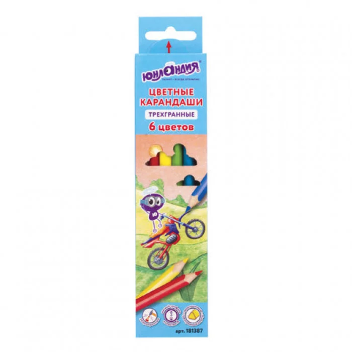 Карандаши цветные ЮНЛАНДИЯ "ЮНЛАНДИК БЫСТРЕЕ ВСЕХ", 6 цветов, трехгранные заточенные, 181387
