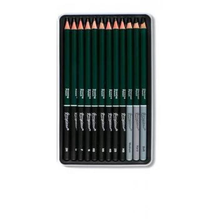 Наборы для скетчинга дают возможность овладеть навыками рисования карандашом, создавать реалистичные рисунки с помощью светотеней. В набор входят чернографитные карандаши 9 штук различной твердости (2H, H, HB, F, B, 2В, 4В, 6В, 8B), 3 угольных карандаша