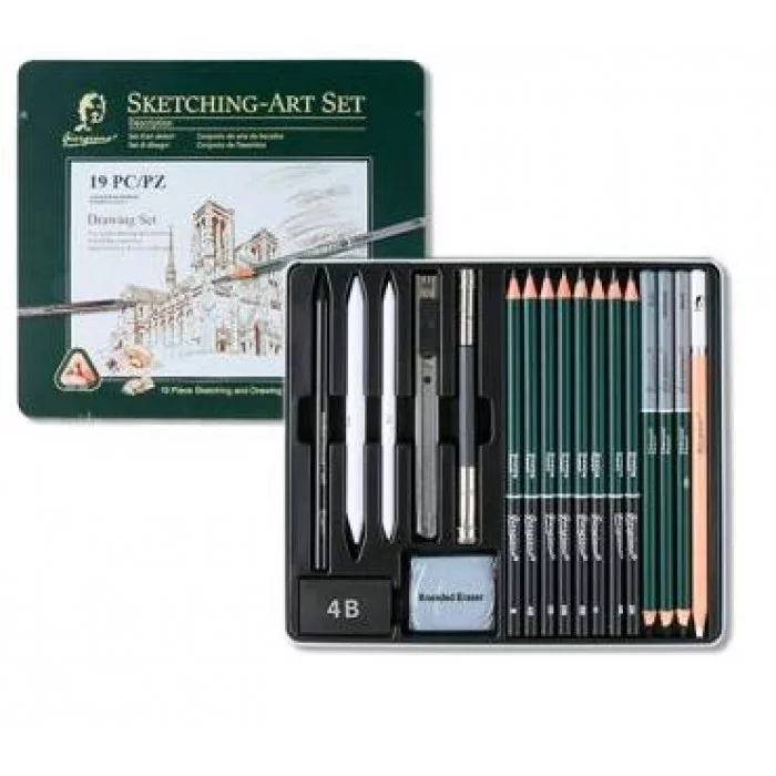 Наборы для скетчинга дают возможность овладеть навыками рисования карандашом, создавать реалистичные рисунки с помощью светотеней. В набор входят чернографитные карандаши 8 штук различной твердости (2H, H, НВ, B, 2В, 4В, 6В, 8В), 4 угольных карандаша soft