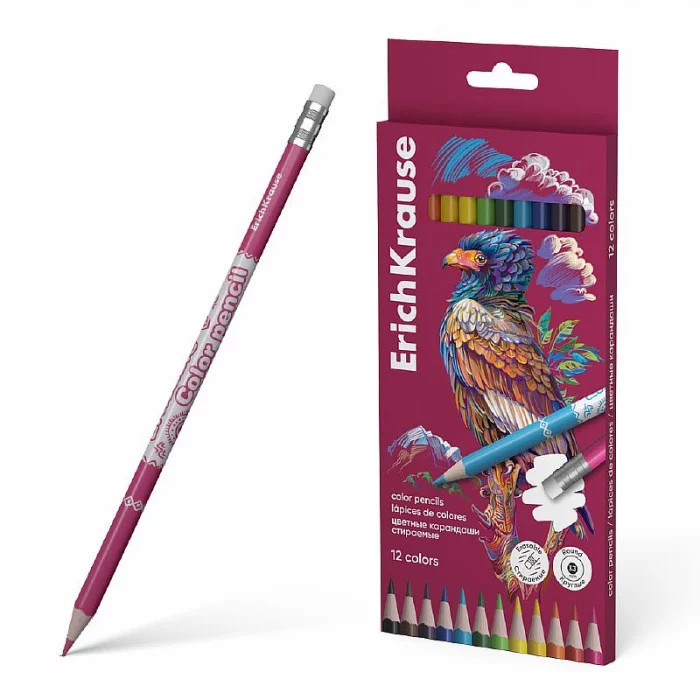 Цветные карандаши деревянные ErichKrause Safari круглые стираемые с ластиком, грифель 3,3 мм, 12 цветов (в коробке с европодвесом 12 шт) 61818