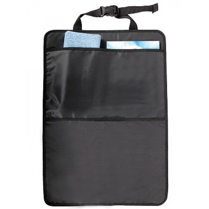 Универсальная защитная накидка-органайзер полноценно закроет спинку автокресла и защитит от грязи, пятен, потёртостей и царапин. Накидка необходима, когда на заднем сидении едет маленький пассажир, чтобы малыш не запачкал ботиночками спинку кресла. Изделие изготовлено из прочного влагостойкого материала, при загрязнении достаточно просто протереть влажной тряпочкой или салфеткой. Аксессуар имеет удобное крепление и подходит для любых автомобилей.