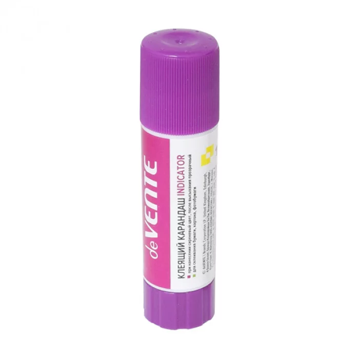 Клеящий карандаш "deVENTE. Indicator" 15 г, фиолетовый, PVA основа, в пластиковой поворотной тубе. Используется для склеивания бумаги различных видов, картона, фотографий и тканей. Главные преимущества твёрдого клея перед жидкими аналогами: