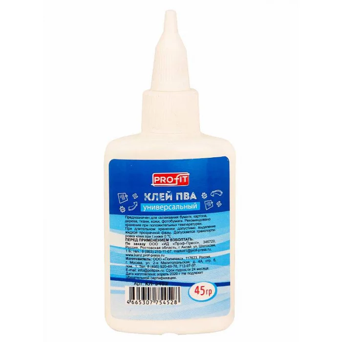 Клей ПВА предназначен для склеивания бумаги, картона, дерева, стекла, кожи, ткани. Удобный флакон с дозатором обеспечивает экономичный расход клея. Не оставляет следов и легко смывается водой. Вес 45 г.