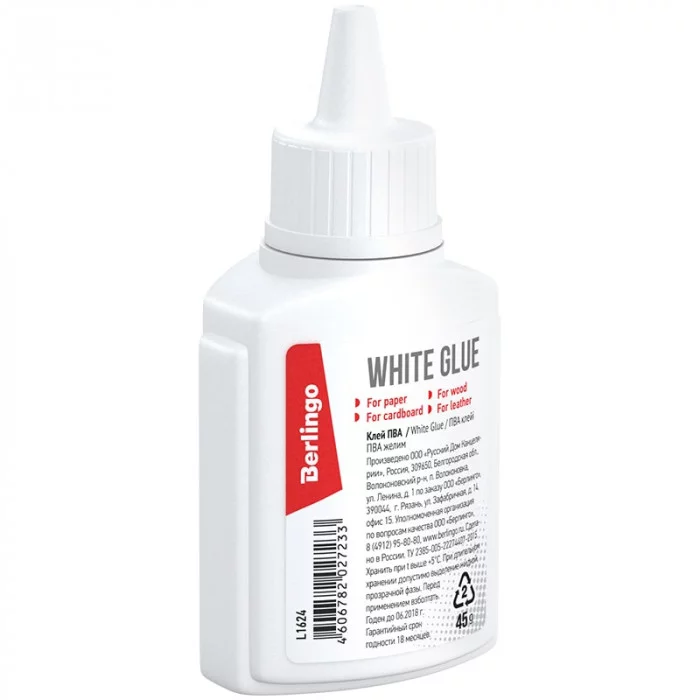 Клей ПВА Berlingo предназначен для склеивания бумаги, картона, дерева, стекла, кожи, ткани. Вес - 45 граммов. Клей морозостойкий. Выдерживает 5 циклов заморозки/разморозки при температуре до -40°С, сохраняя при этом однородность текстуры и потребительские свойства. Упаковка не деформируется при низких температурах. Хранить при температуре свыше +5°С. Удобный флакон с дозатором, который обеспечивает экономичный расход клея. Не содержит растворителя. Не оставляет следов и легко смывается водой.