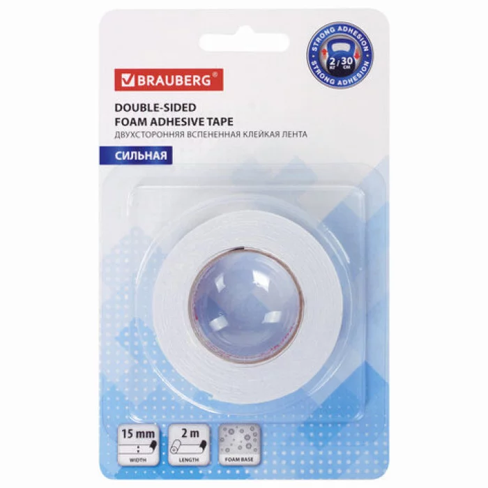 Клейкая двухсторонняя лента 15 мм х 2 м, НА ВСПЕНЕННОЙ ОСНОВЕ 1 мм, прочная, BRAUBERG 606418
