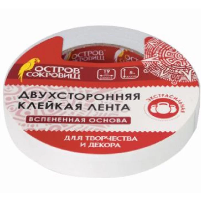 Двухсторонняя клейкая лента на вспененной основе ОСТРОВ СОКРОВИЩ применяется для оформительских и декоративных работ, крепления мелких элементов, составления коллажей и многого другого.