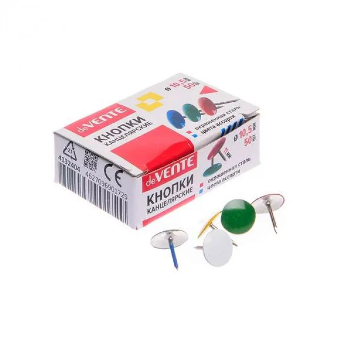 Кнопки канцелярские "deVENTE" диаметр 9 мм, цветные 50 шт в картонной коробке