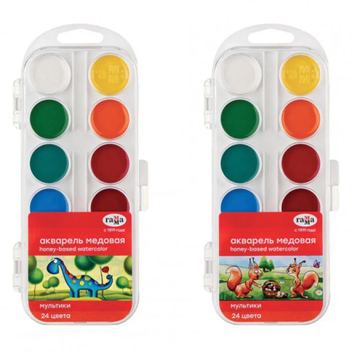 Акварель Гамма "Мультики" NEW, медовая, 24 цвета, без кисти, пластик. упак., европодвес 300256