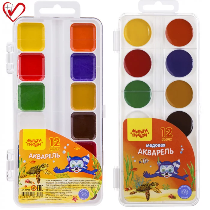 Краски акварельные Мульти-Пульти обладают хорошей укрывистостью и остаются яркими при высыхании. Смешивание акварели Мульти-Пульти дает чистые оттенки. Натуральные компоненты делают ее безопасной для здоровья детей. Пластиковая упаковка акварели удобна в использовании. Для детей старше 3-х лет. Количество цветов: 12; Форма кюветы: круглая; Объем кюветы: 3,5 см3.