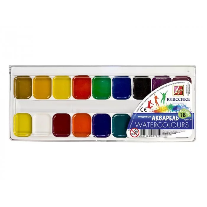 Краски акварельные изготовлены на основе органических пигментов и натурального связующего с добавлением пчелиного мёда. Предназначены для детского творчества и различных живописных работ. Отличаются хорошей прозрачностью, яркостью и чистотой цвета. Цвета: белила, желтый, лимонный, желтый темный, оранжевый, охра, светло-рубиновый, розовый, сиреневый, зеленый, изумрудно-зеленый, голубой, синий, черный, коричневый, фиолетовый, светло-зеленый, алый. Количество цветов в наборе: 18. Серия: Классика. Добавка в основу: мед. С кистью: да. Отделение для кисточки: да. Форма кювет: квадратная. Упаковка: пластиковая коробка Бренд - ЛУЧ. Производитель - Россия. Артикул - 19С1293-08. Штрихкод - 4601185007820