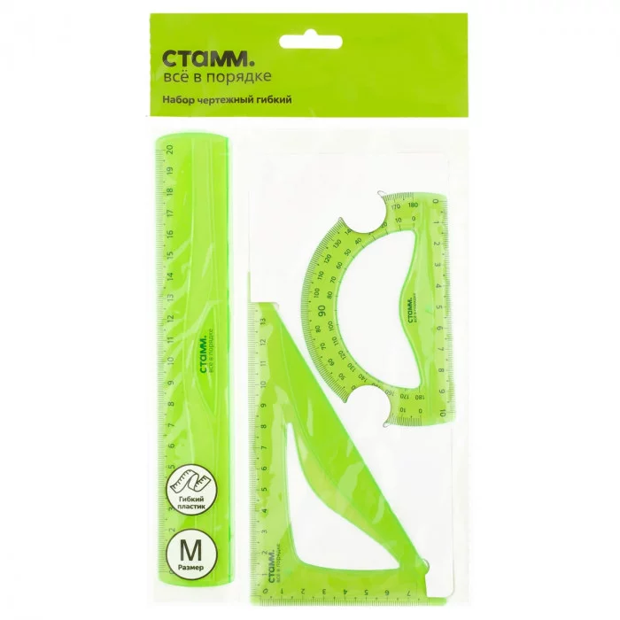 Набор чертежный гибкий, средний «СТАММ» предназначен для выполнения чертёжных и измерительных работ. В набор размера M входят: линейка со шкалой 20 см; треугольник со шкалой 13 см и углом 30°; транспортир 180° и шкалой 10 см. Изготовлен из высококачественного ПВХ. Изделия имеют безопасные закругленные углы и четкую миллиметровую шкалу. Устойчивы к деформации. Упакованы в пакет с европодвесом. Цвет изделий – прозрачный зелёный.