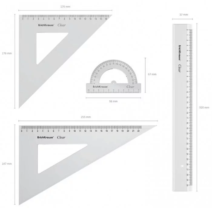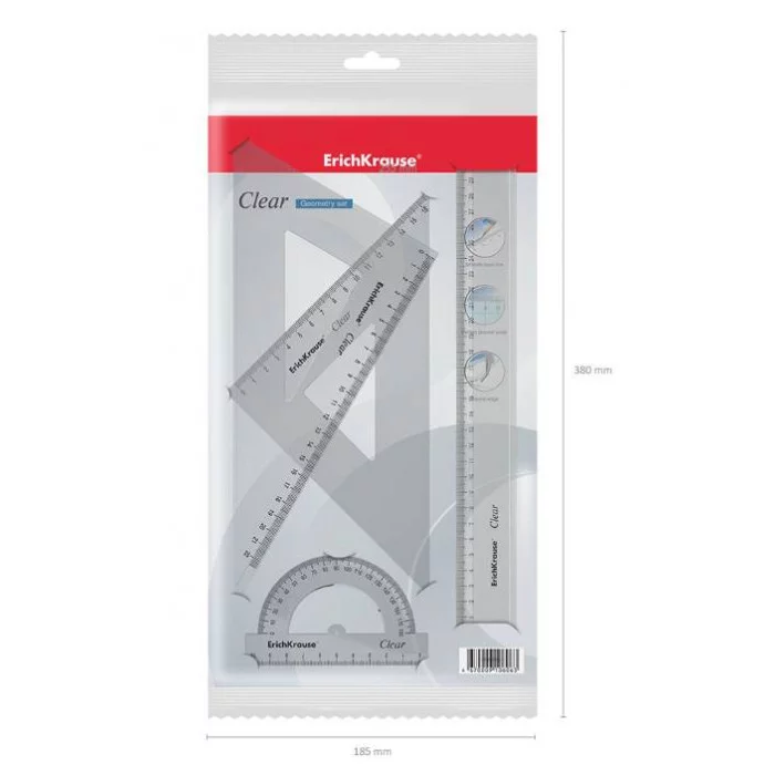 Набор геометрический прозрачный из высококачественного пластика. В комплекте 4 предмета: линейка с держателем 20см, угольник 16см/45°, угольник 22см/60°, транспортир 360°/12см.