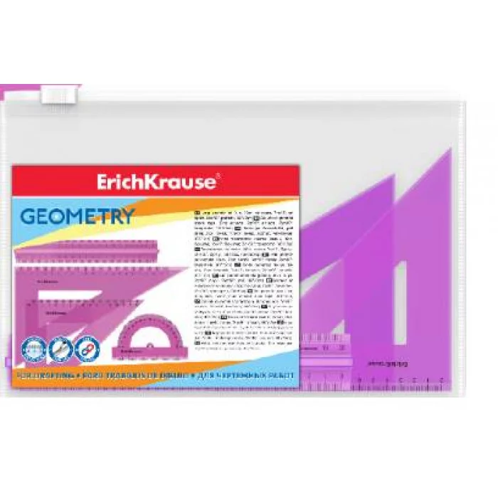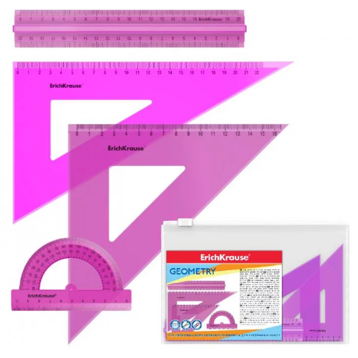 Набор геометрический полупрозрачный из высококачественного пластика. В комплекте 4 предмета: линейка с односторонней шкалой 30см, угольник 16см/45°, угольник 22см/60°, транспортир 180°/10см.
