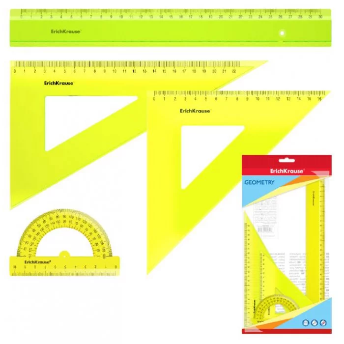 Набор геометрический прозрачный из высококачественного пластика. В комплекте 4 предмета: линейка с односторонней шкалой 30см, угольник 16см/45°, угольник 22см/60°, транспортир 180°/10см.