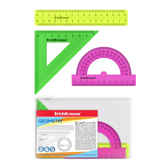 Набор геометрический непрозрачный из высококачественного пластика. В комплекте 3 предмета: линейка с двусторонней шкалой 15см – желтый, угольник 45°/7см – зеленый, транспортир 180°/10см – розовый.