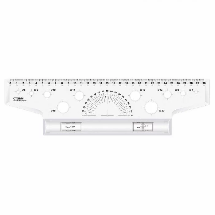 Рейсшина 30 см СТАММ предназначена для выполнения чертёжных и измерительных работ. Линейка-рейсшина оборудована металлическим роликом, и идеально подходит для нанесения ровных параллельных линий. Длина шкалы – 30 см. Благодаря специальному покрытию ролика линейка не проскальзывает по бумаге. На изделии предусмотрен транспортир 180° и 10 трафаретов окружностей. Изготовлена из качественного полистирола. Рейсшина упакована в картонную коробку с европодвесом. Цвет изделия - прозрачный бесцветный. Длина: 30 см; Материал линейки: полистирол; Материал ролика: металл; Цвет: прозрачный бесцветный.