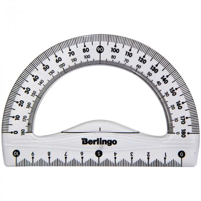 Транспортир пластиковый, 10 см, 180°, безопасные закругленные края, высококачественная градуировка с использованием УФ-чернил. Индивидуальная упаковка в пакет с европодвесом.